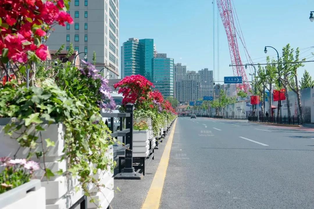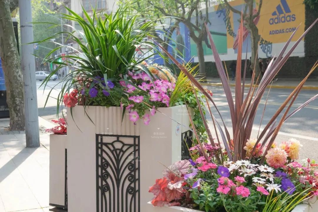 南京西路、西藏南路等道路花箱采用三角梅搭配各色南非萬壽菊、常春藤等,景觀效果靚麗奪目、清新自然。