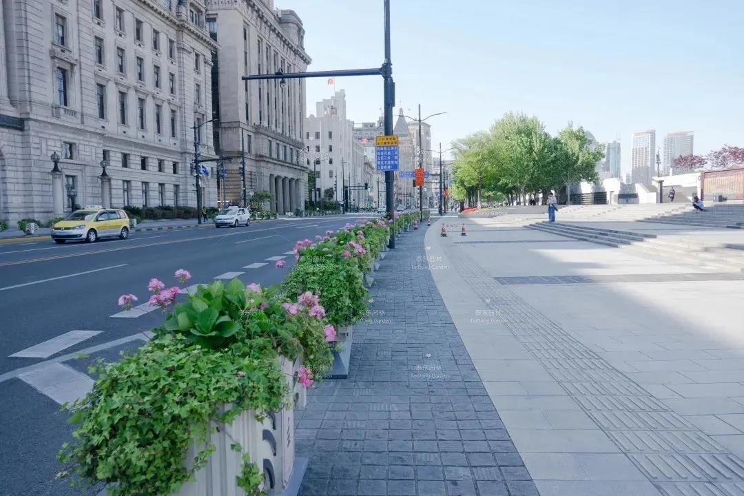 西藏中路沿線花箱選用龍血樹、亮金女貞,搭配孔雀草、小麗花、南非萬壽菊、矮牽牛、礬根、常春藤等,為車水馬龍的繁忙道路帶來青蔥輕盈、靚麗繽紛的綠色氣息。