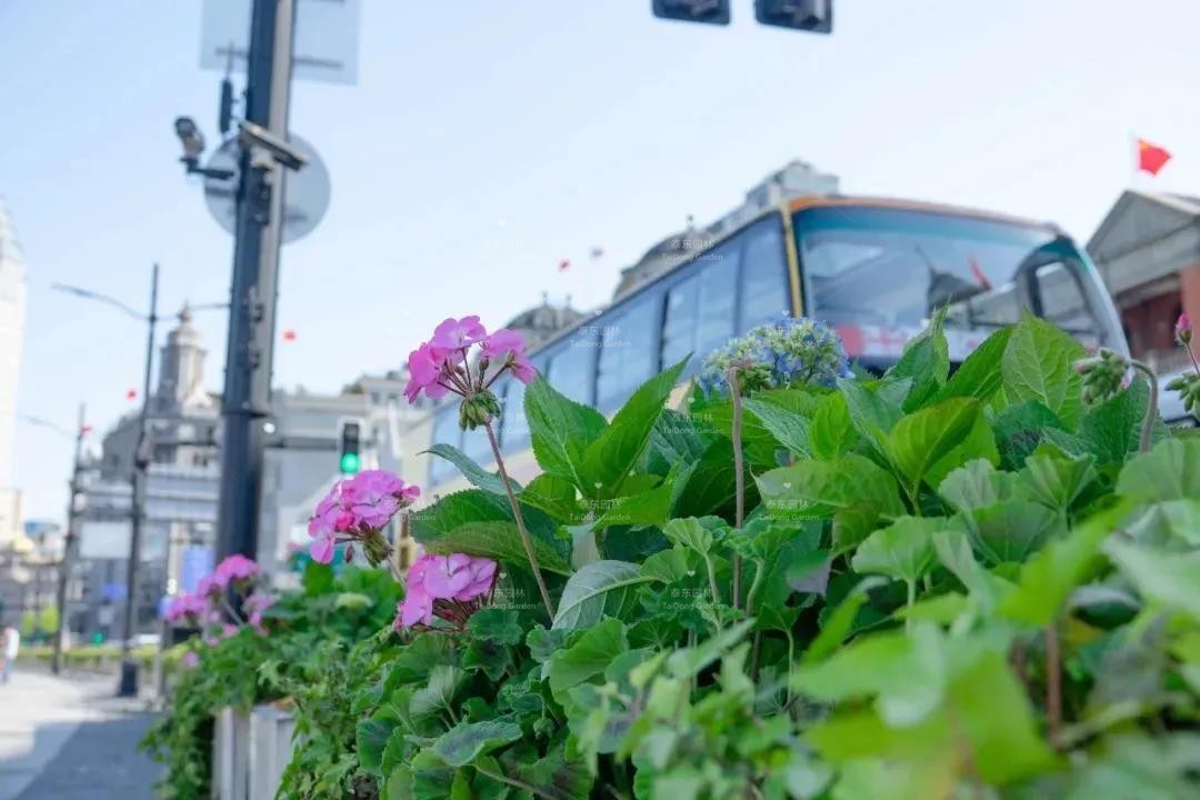外灘花箱選用紅色及紫色大麗菊,或藍色繡球無盡夏搭配粉色天竺葵。現大麗菊及繡球花正含苞待放,漸入佳境。